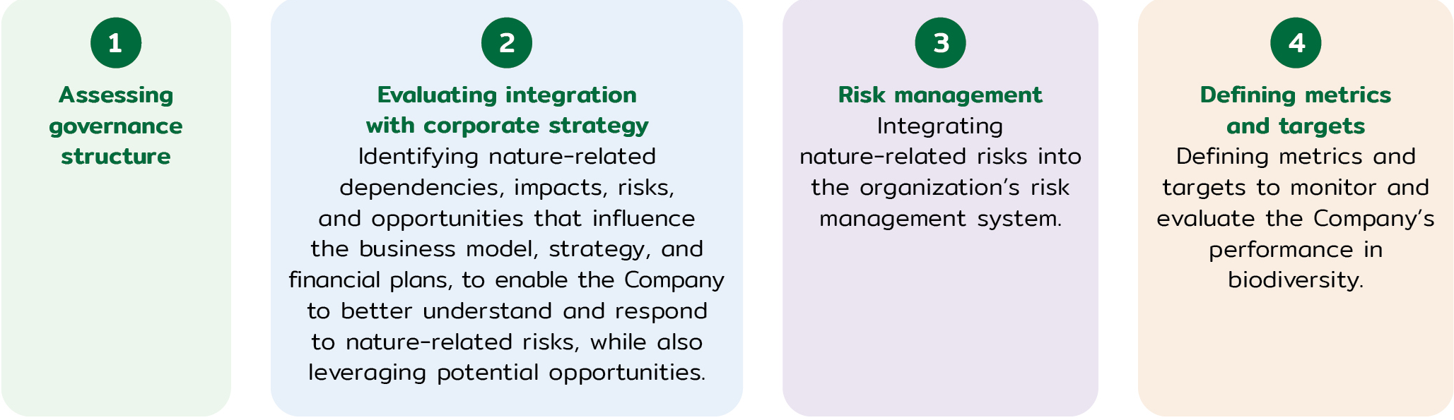 Biodiversity management aligns with the Taskforce on Nature-related Financial Disclosures (TNFD)* framework, which guides the assessment and transparent disclosure of nature-related information to stakeholders. The framework includes: