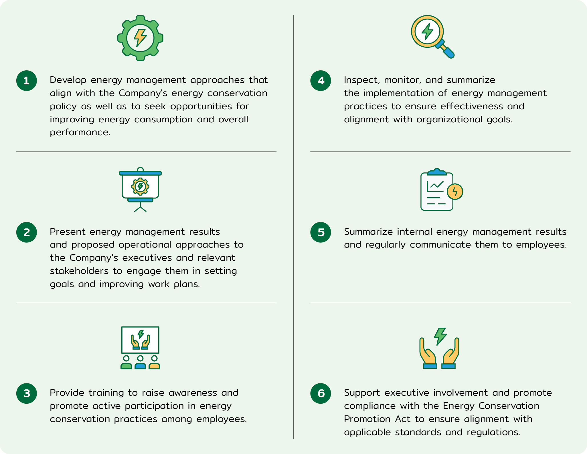 Mitr Phol has established a clear energy management policy and systematically developed practical implementation plans, prioritizing execution, monitoring, and evaluation while also promoting awareness and understanding of proper energy management practices among employees at all levels. These efforts are in line with the Energy Conservation Promotion Act B.E. 2550. Each factory has established an energy management working group with the following roles and duties: