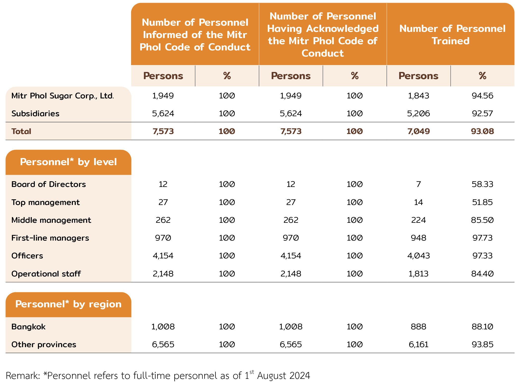 Remark: Mitr Phol's personnnel will be 100% trained in the Code of Conduct by 2025.