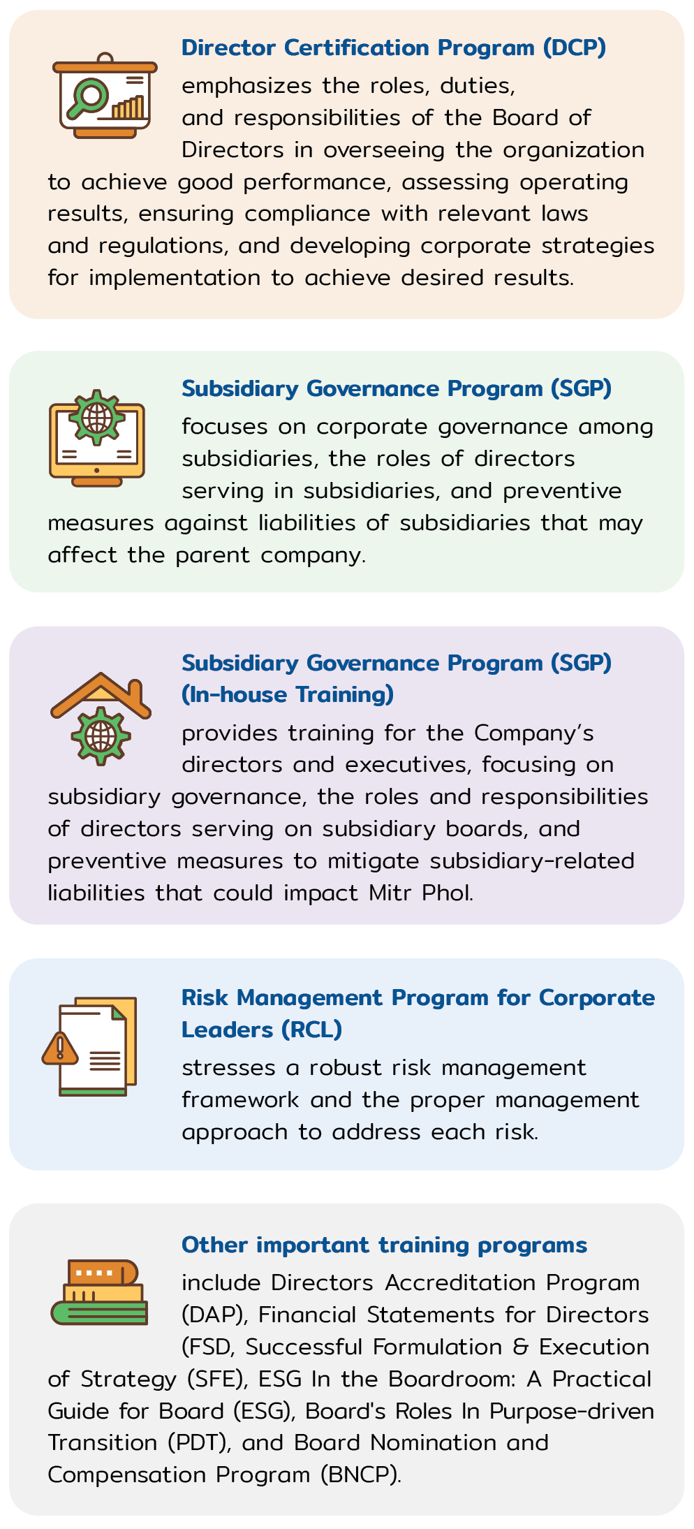 Ongoing communication of policies, relevant practices, and the  Mitr Phol Code of Conduct  is essential for fostering awareness and understanding among all personnel, including directors, executives, and employees. These efforts are carried out through various communication channels to ensure the effective implementation of corporate governance and business ethics. Examples of initiatives include employee training sessions, integrating content into onboarding programs for new employees, placing promotional signage at factories and offices, and disseminating information about internal and external activities via email and the Company’s website. Additionally, the Company has established communication channels to centralize information on corporate governance, risk management, and legal compliance. These channels ensure that Mitr Phol personnel stay up to date with relevant news, policies, and practices through engaging formats such as infographics, educational videos, and various activities. To consistently reinforce awareness and understanding, 100% of Mitr Phol personnel are required to sign and acknowledge their commitment to the Code of Conduct on an annual basis. In 2024, the Company continued the training on “Mitr Phol Code of Conduct and Corporate Discipline” for the 7th consecutive year. The primary aim is to communicate and raise awareness of the Mitr Phol Code of Conduct and Corporate Discipline in a detailed and simple manner, with the target of 100% of Mitr Phol personnel being trained by 2025.