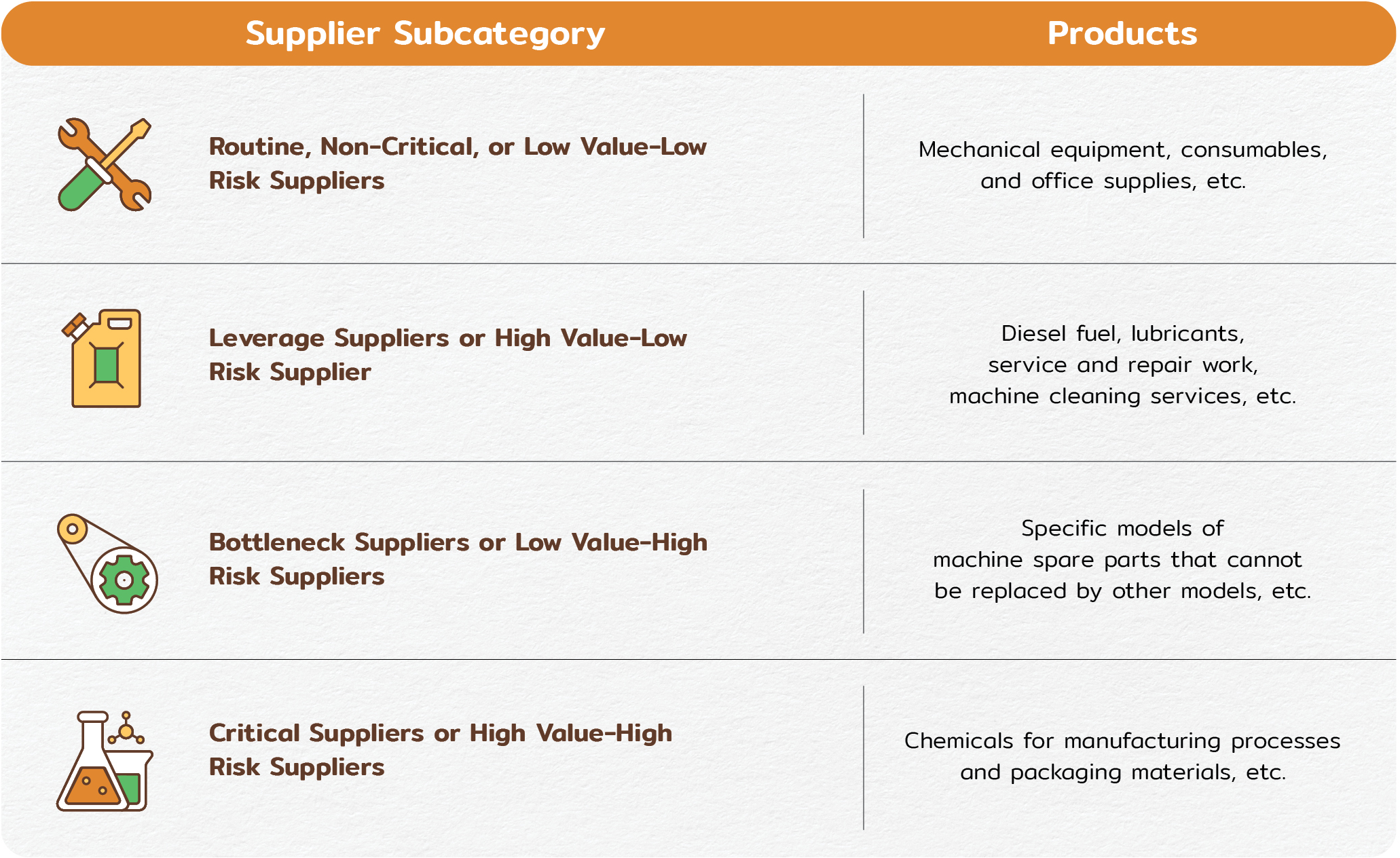They are providers of products and services or domestic and foreign contractors. Central suppliers are further classified into four subcategories as follows: