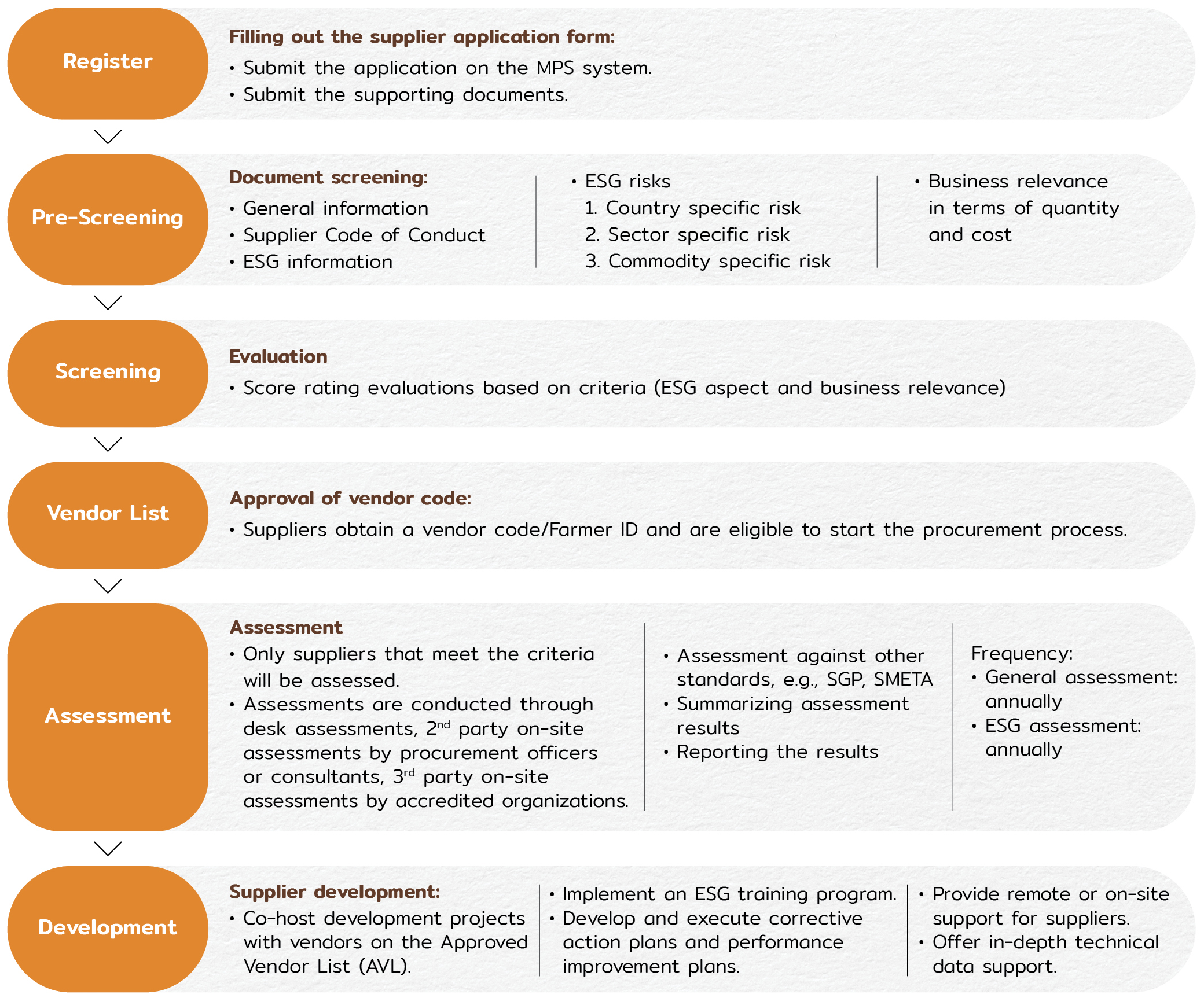 In addition, the Company has established an annual process for monitoring and evaluating partner performance. This includes assessments of product and service quality and standards, as well as reviews of environmental, social, and governance (ESG) risks for suppliers. This is to ensure that its suppliers strictly adhere to the Supplier Code of Conduct and to mitigate risks related to product quality, supply chain disruptions, and other operational concerns. Supplier performance is evaluated annually through self-assessments using questionnaires, 2nd party on-site assessment, or 3rd party on-site assessment based on internationally recognized standards such as the Bonsucro Standard for sustainable sugarcane production, the Supplier Guiding Principles, and the Sedex Members Ethical Trade Audit (SMETA). Assessment results are communicated to partners via email or other designated channels. Suppliers may also benchmark their results with those of other suppliers, enabling them to identify areas for improvement, enhance operational efficiency, and support continuous development. If a supplier is found to be in breach of the Supplier Code of Conduct, such as through violations of human rights, environmental standards, or corporate governance, the Company will issue a warning, outline a corrective action plan with a specific timeline, and closely monitor progress. Failure to comply may result in penalties, including contract termination and permanent removal from the Company's approved supplier list. Failure to comply with the minimum ESG requirement may result in penalties, including contract termination and permanent removal from the Company's approved supplier list. Moreover, suppliers with better ESG performance/score are more likely to be selected or awarded contracts, as sustainability performance is a key factor in the Company's supplier selection process. At present, ESG assessments are conducted for Significant Tier-1 suppliers, including those providing chemicals and packaging.