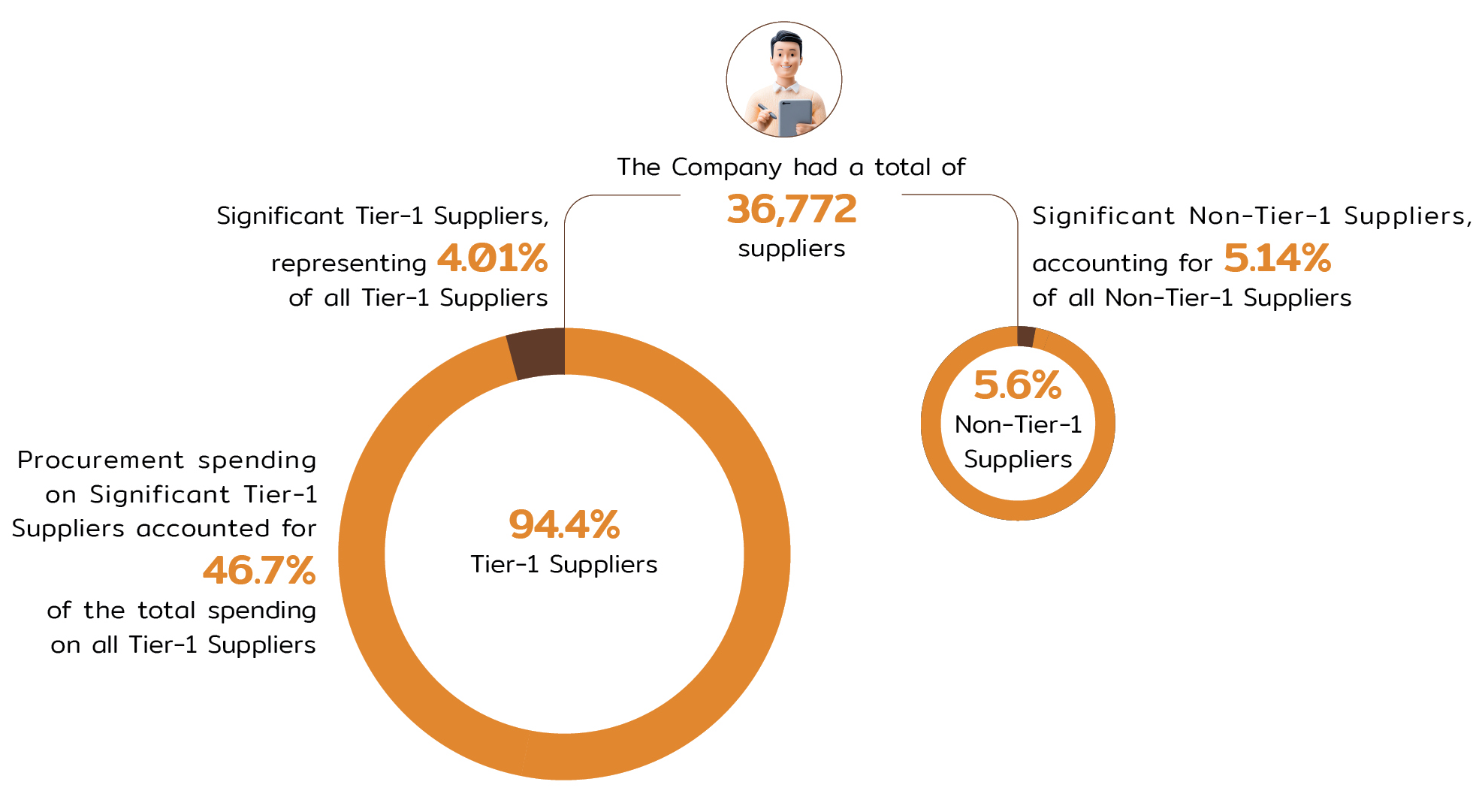 In 2024, the Company had a total of 36,772 suppliers, comprising 94.4% Tier-1 Suppliers and 5.6% Non-Tier-1 Suppliers. Among these, 1,391 were classified as Significant Tier-1 Suppliers, representing 4.01% of all Tier-1 Suppliers, while 106 were Significant Non-Tier-1 Suppliers, accounting for 5.14% of all Non-Tier-1 Suppliers. Procurement spending on Significant Tier-1 Suppliers accounted for 46.7% of the total spending on all Tier-1 Suppliers.