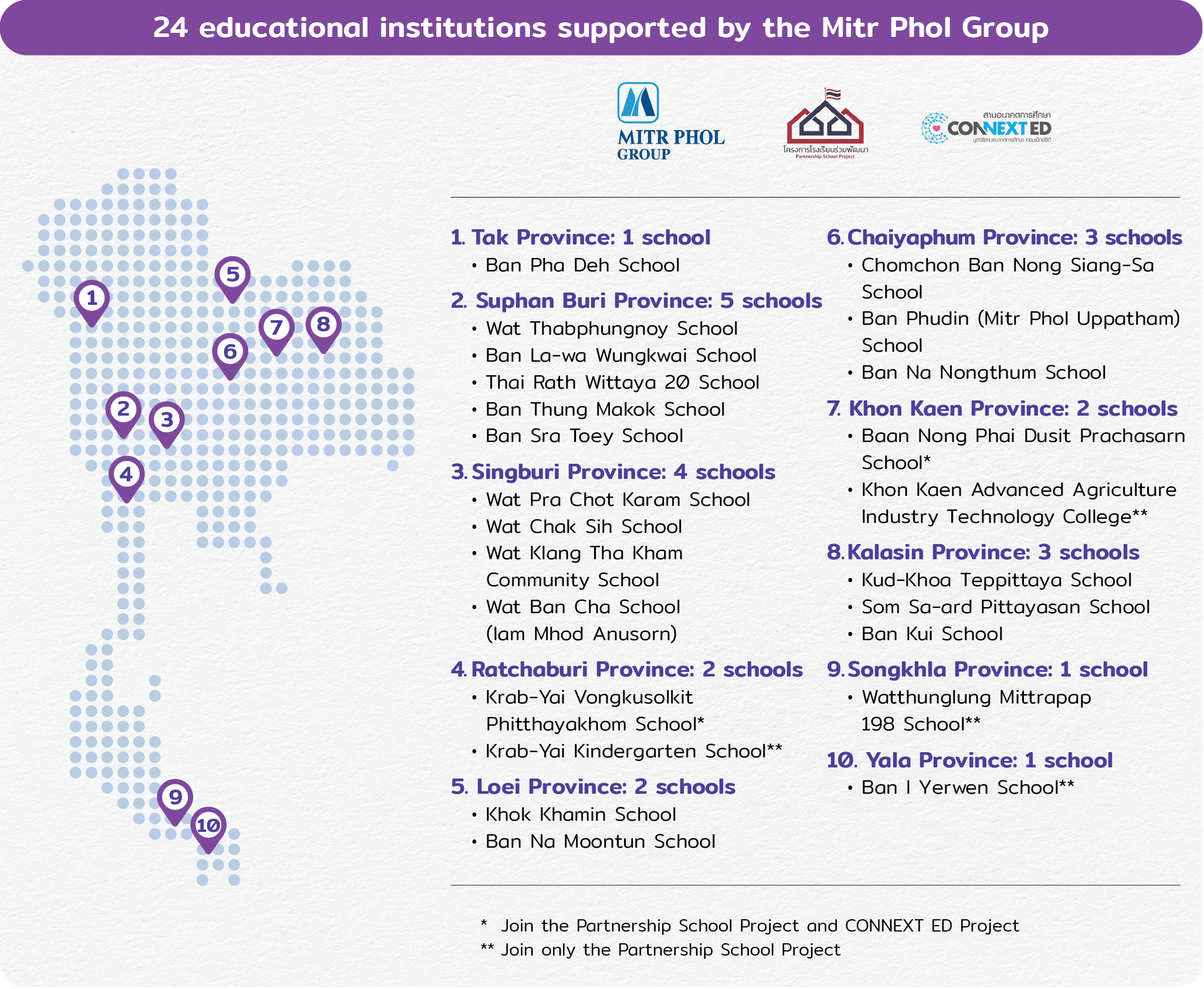 Since 2016, Mitr Phol has been one of the 12 founding organizations of the CONNEXT ED Foundation, established in collaboration with other private sector partners with a shared commitment to raising the standard of education and laying a foundation for sustainable national development. To date, 20 schools across 8 provinces in the central and northeastern regions have participated in the project.