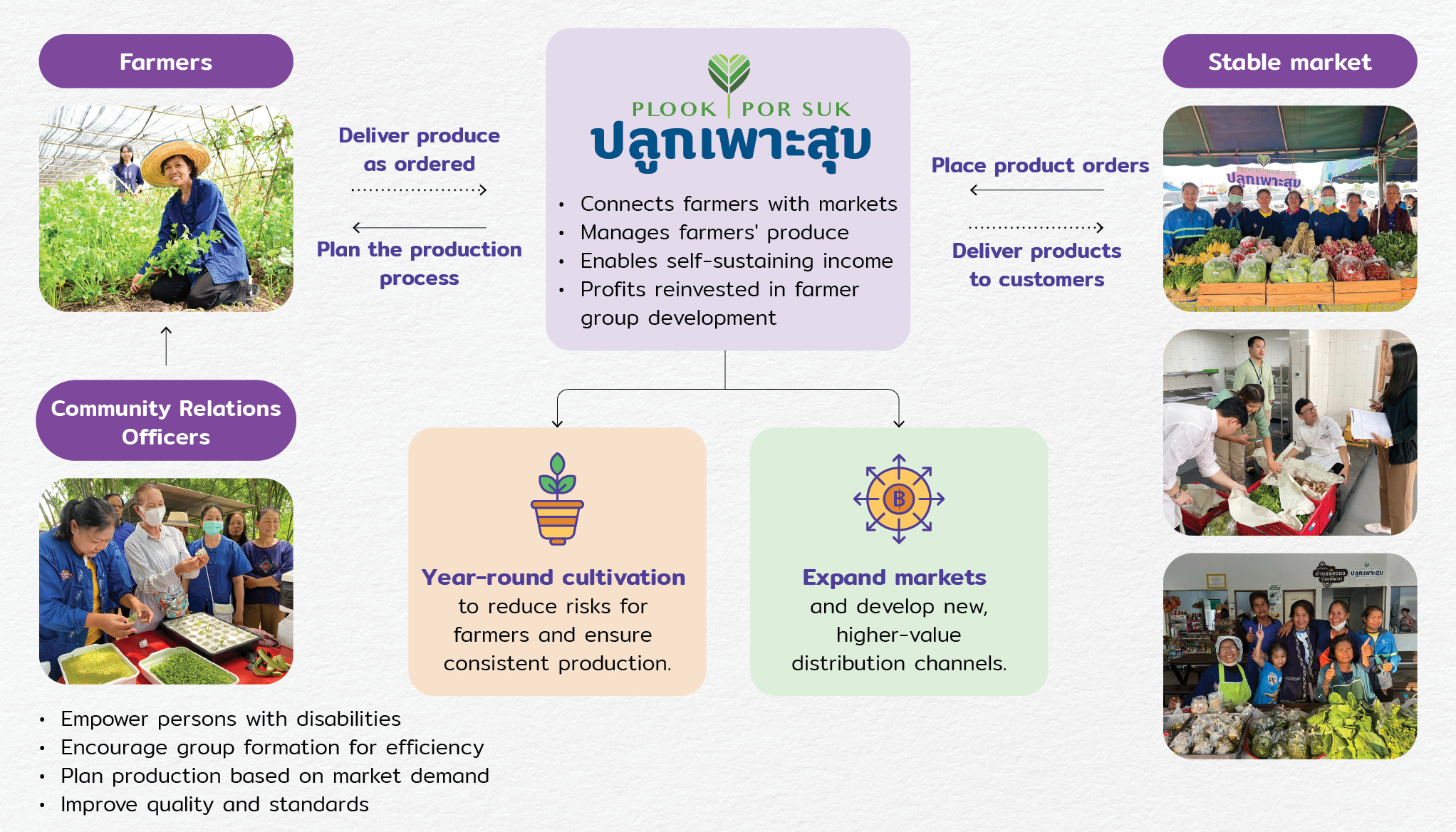 In addition to supporting farmers through training and establishing a marketing foundation, Plook Por Suk Co., Ltd. also promotes the employment of persons with disabilities in the community. In 2024, the Company hired 50 individuals with disabilities to serve as Sustainable Community Development Assistants. These individuals play a key role in bridging communities and factories to foster sustainable community development. Their work includes understanding the needs of communities surrounding the factories—particularly vulnerable groups—to help build a more inclusive society, support continuous job creation, and raise awareness of environmental conservation.